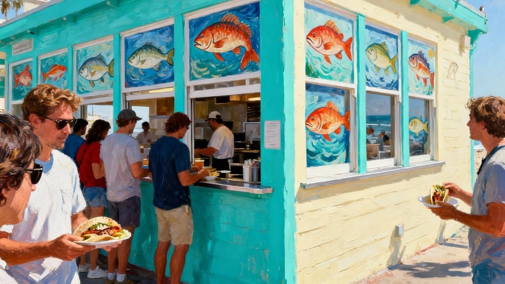 500+ reviews across Google, Yelp, and TripAdvisor track the pattern. Fish is grilled, not fried, which makes a difference; handmade tortillas hold up without breaking. Get the grilled halibut tacos, not fried. Timing: No reservations; quick counter service, lunch rush (12-1:30pm) can be busy but service is fast.